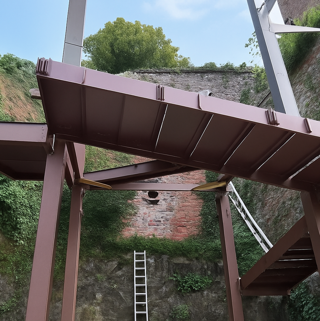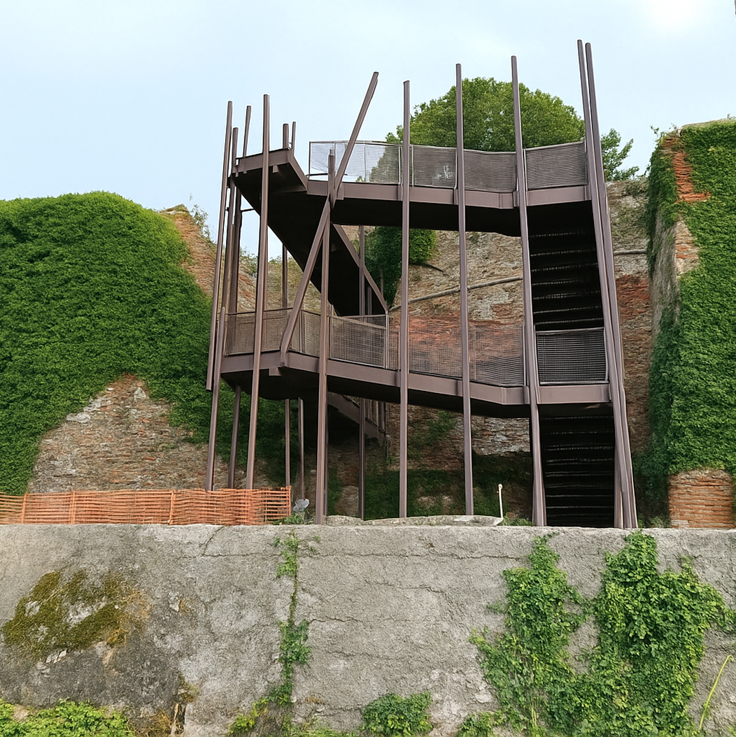 Intervenire su un'acropoli medievale significa confrontarsi con vincoli stratificati e condizioni al limite. La sfida principale è duplice: collegare quote altimetriche diverse mantenendo l'integrità della cinta muraria e gestire lavorazioni complesse dove ogni metro quadro comporta interferenze con preesistenze storiche tutelate.